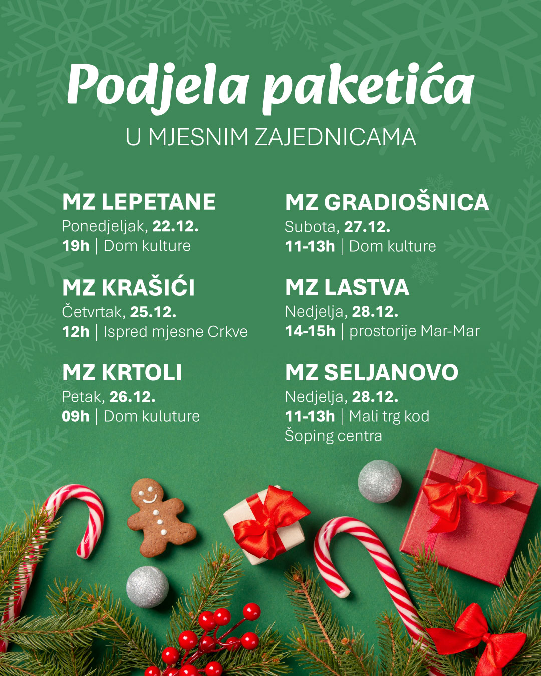 U susret novogodišnjim praznicima, Sekretarijat za lokalnu upravu Općine Tivat je i ove godine opredijelio novčana sredstva za podršku u nabavci i organizaciji dodjele novogodišnjih paketića za najmlađe sugrađane po mjesnim zajednicama, u iznosu od  800 eura za svaku MZ.