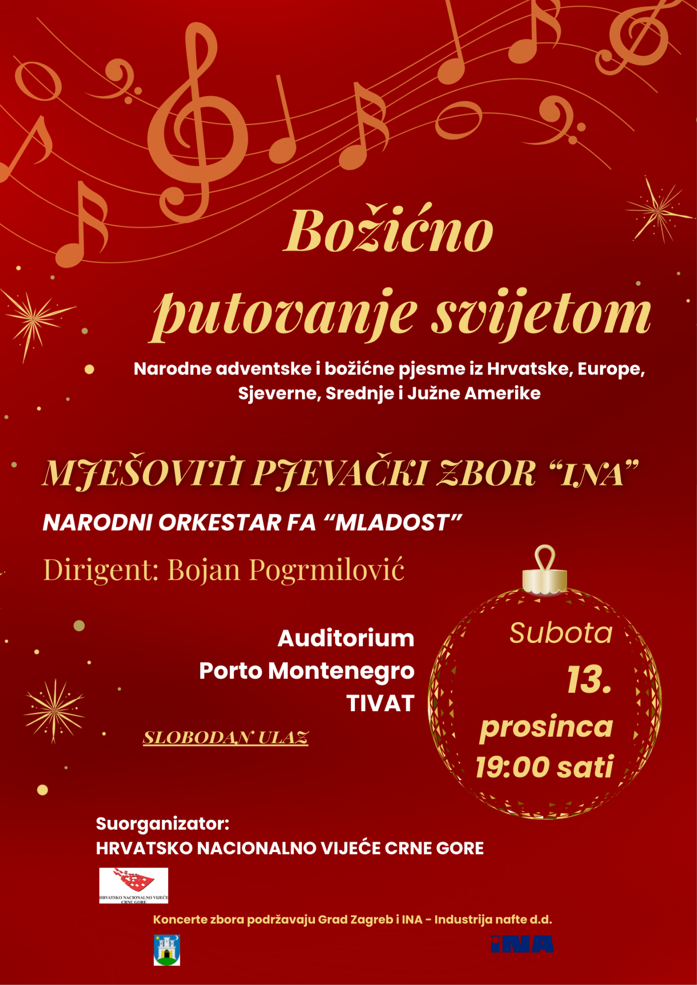 Svečani koncert ,, Božićno putovanje svijetom'', održava se u ovu subotu, 13. 12. 2025., u dvorani Auditorium Porto Montenegro, bivši Dom vojske na Seljanovu, s početkom u 19 sati.