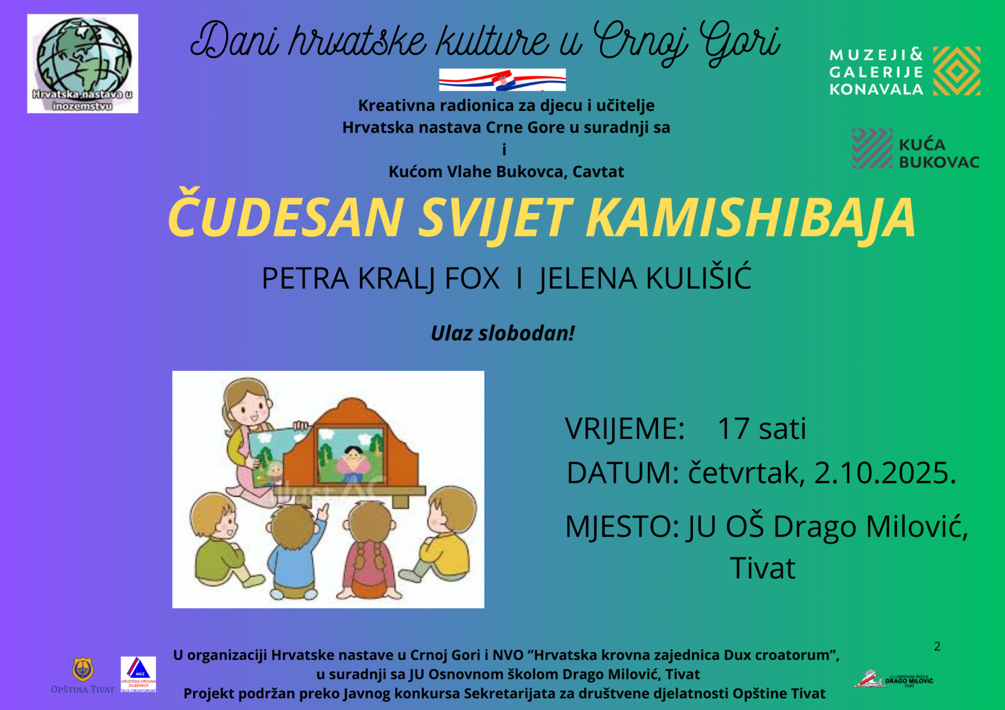 "Pozivamo vas da nam se pridružite na manifestaciji Dani hrvatske kulture u Crnoj Gori – susretu na kojem s ponosom čuvamo i dijelimo bogatstvo hrvatske riječi, pjesme, umjetnosti i običaja. U organizaciji Hrvatske nastave u Crnoj Gori , a u suradnji s NVO Hrvatska krovna zajednica Dux Croatorum , ovaj događaj okuplja nas u duhu zajedništva i kulturnih razmjena. Projekt je podržan kroz javni konkurs pod pokroviteljstvom Sekretarijata za djelatnosti Opštine Tivat , kojima upućujemo iskrenu zahvalnost. Posebni čar programa daju naše gošće iz Republike Hrvatske, iz Cavtata – Petra Kralj Fox , muzejska pedagoginja, i Jelena Kulišić , savjetnica odgajatelja. One će voditi kreativne radionice posvećene kamišibaju – tradicionalnom japanskom „papirnatom kazalištu“, spoju pripovijedanja, glume i likovne umjetnosti. Kamišibaj, premda dolazi iz Japana, sve je popularniji u europskim knjižnicama, vrtićima i školama, a danas ga – zahvaljujući našim gošćama – otkrivamo i u Boki kotorskoj" - pozivaju organizatori te poručuju "Dani hrvatske kulture u Crnoj Gori – radosno slavlje kreativnosti i pripadnosti".