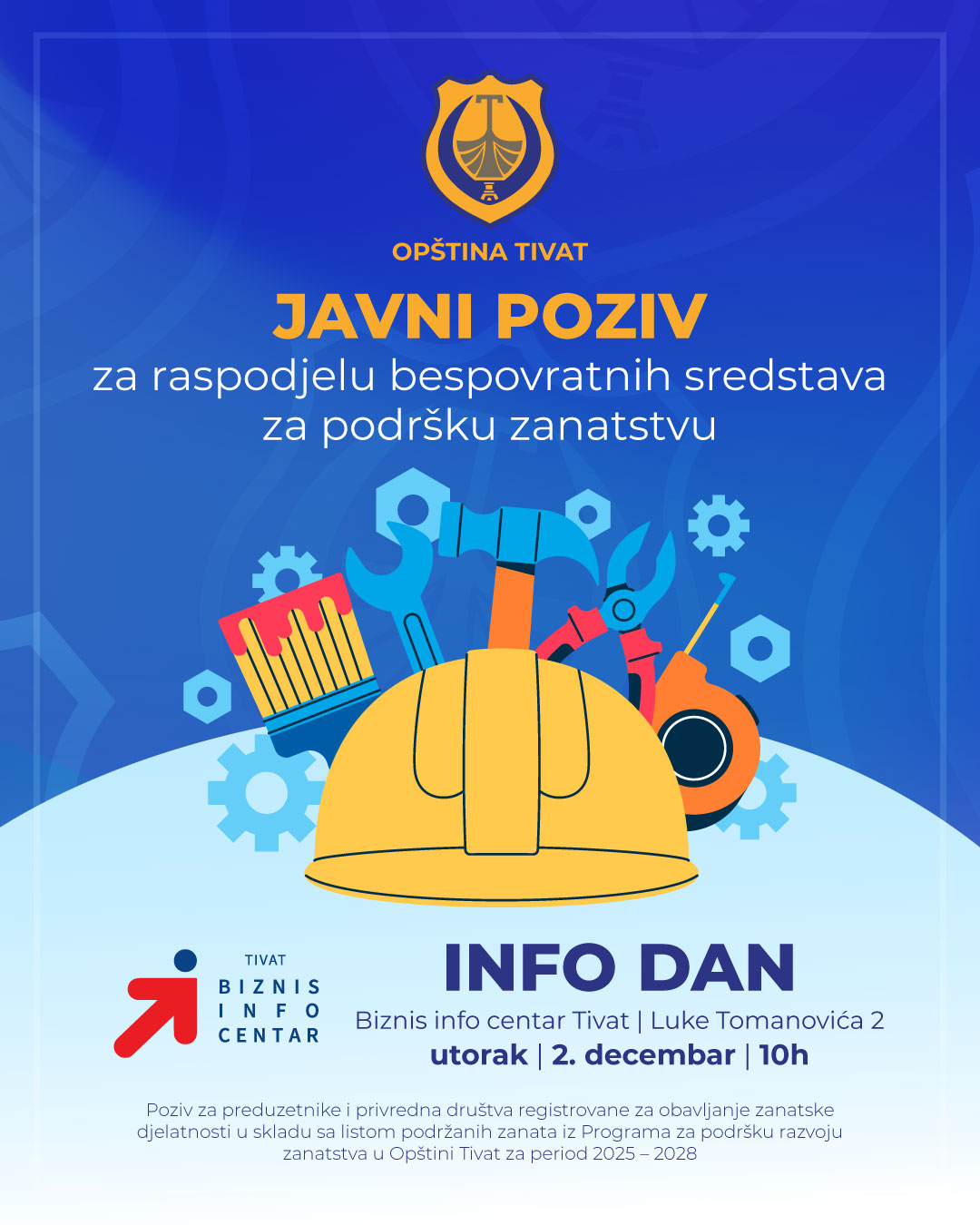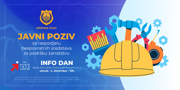 Komisija za raspodjelu sredstava raspisala je Javni poziv za raspodjelu bespovratnih sredstava iz budžeta Općine Tivat opredijeljenih za podršku razvoja zanatstva. Poziv se odnosi na poduzetnike i privredna društva koji su registrirani za obavljanje zanatske djelatnosti, u skladu s listom podržanih zanata iz Programa za podršku razvoju zanatstva u Općini Tivat za period 2025 – 2028.
