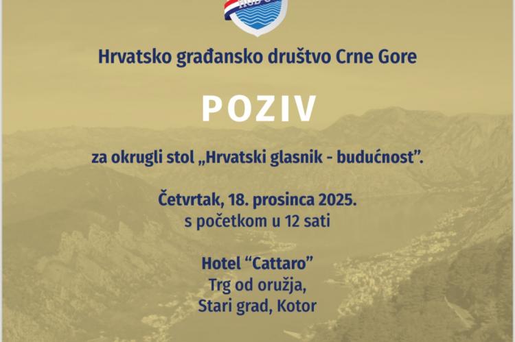 Hrvatsko građansko društvo Crne Gore organizira okrugli stol pod nazivom „Hrvatski glasnik – budućnost“, koji će se održati u četvrtak, 18. prosinca 2025. godine, s početkom u 12 sati. Okrugli stol održat će se u Hotelu „Cattaro“, na Trgu od oružja, u Starom gradu u Kotoru.