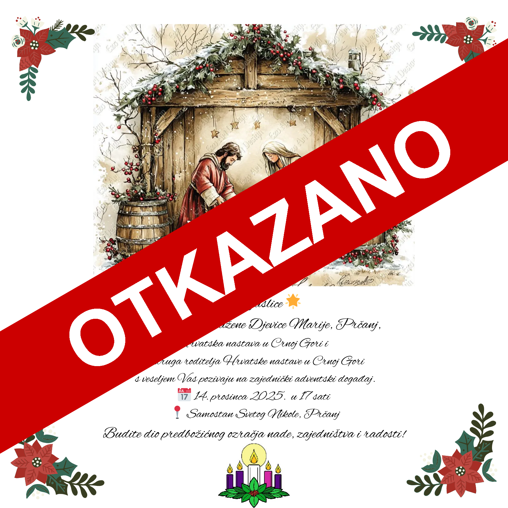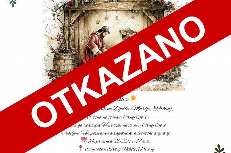 Župa Rođenja Blažene Djevice Marije, Hrvatska nastava u Crnoj Gori te Udruga roditelja Hrvatske nastave u Crnoj Gori srdačno pozivaju na svečani adventski događaj “Žive jaslice”.