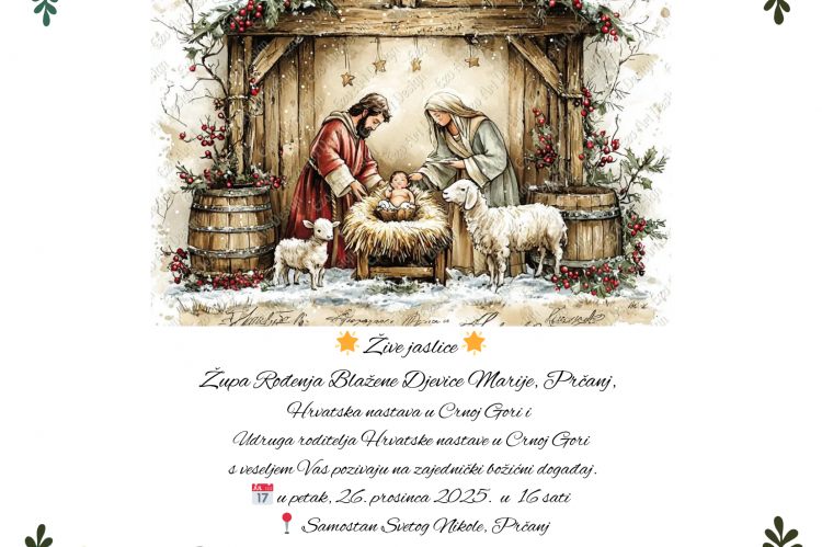 Župa Rođenja Blažene Djevice Marije ( Prčanj ), Hrvatska nastava u Crnoj Gori i Udruga roditelja učenika Hrvatske nastave Crne Gore s ponosom najavljuju zajednički događaj Žive jaslice , koji će se održati 26. 12., u prekrasnom ambijentu Samostana svetog Nikole.