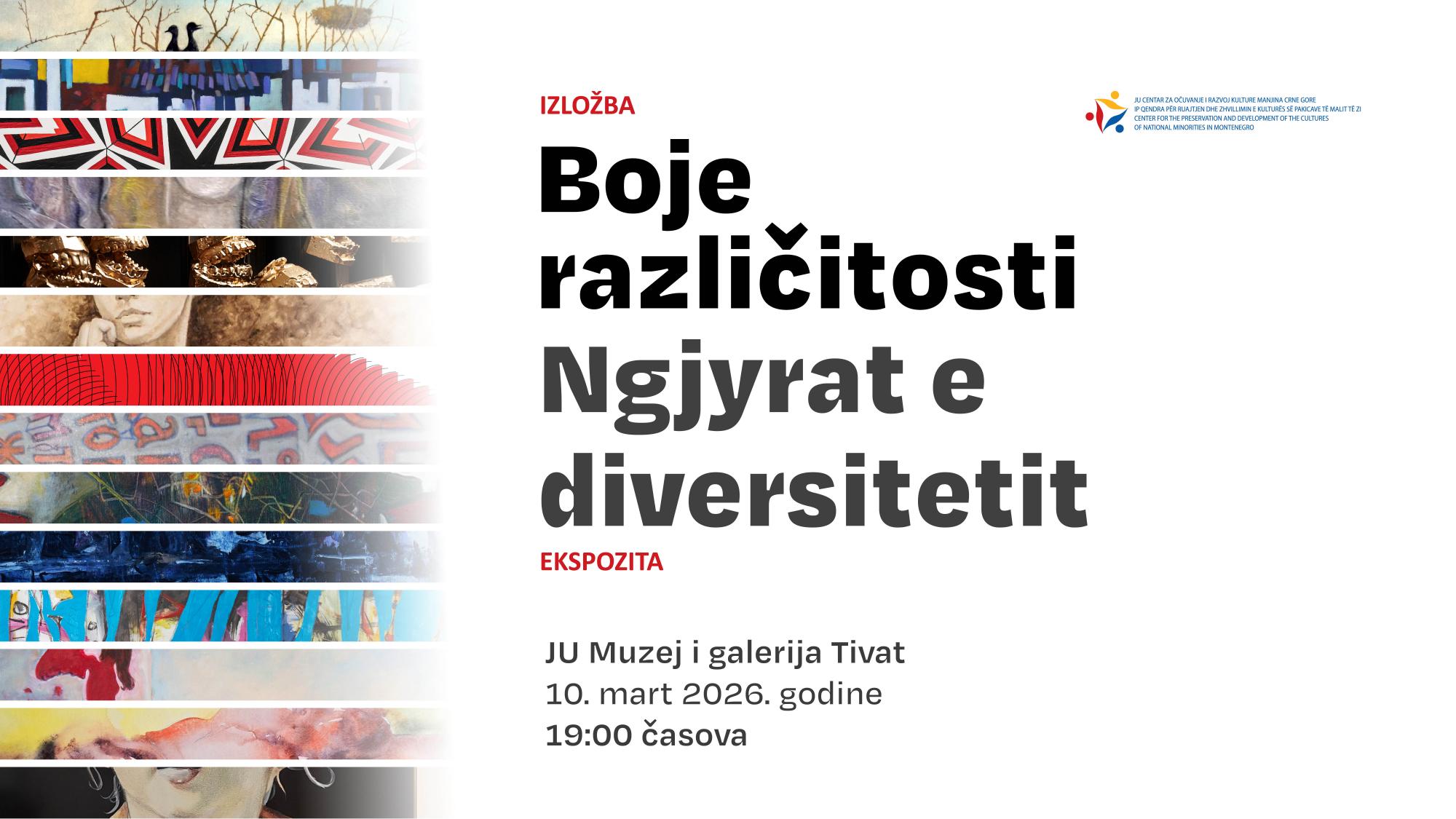 JU Centar za očuvanje i razvoj kulture manjina Crne Gore organizira otvorenje kolektivne izložbe „Boje različitosti“, koje će se održati 10. ožujka, u JU Muzej i galerija Tivat, s početkom u 19 sati.