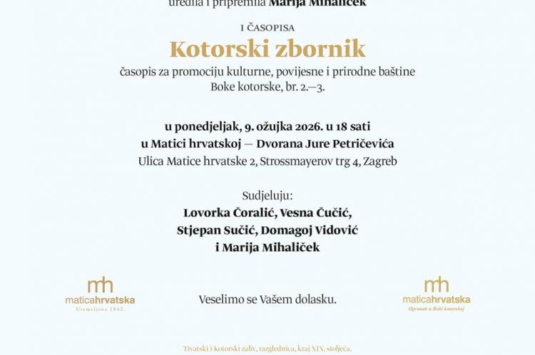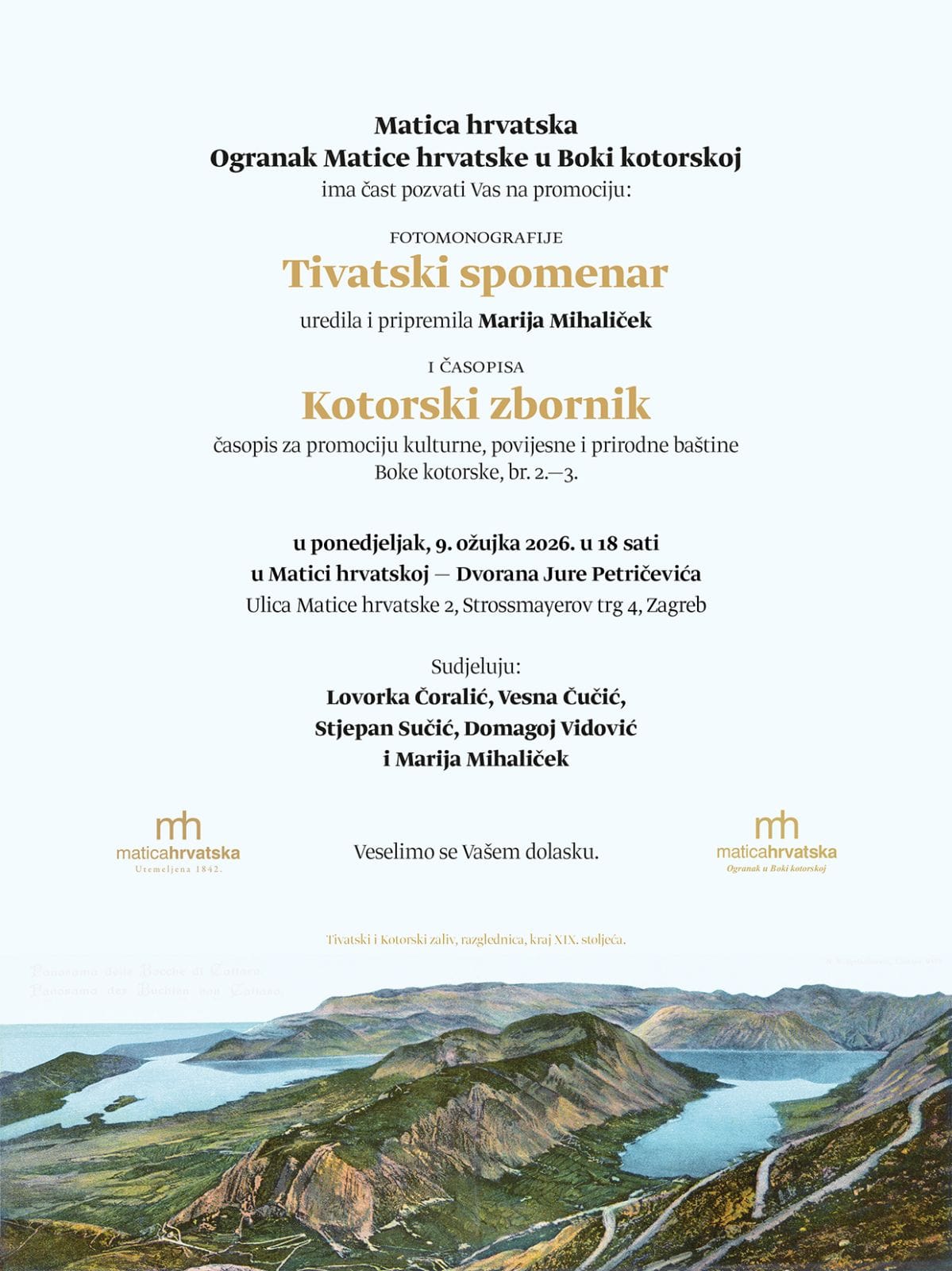 Promocija fotomonografije „Tivatski spomenar“ i časopisa „Kotorski zbornik“ bit će održana u Zagrebu u organizaciji Matice hrvatske i Ogranka Matice hrvatske u Boki kotorskoj.