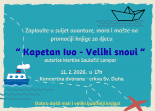Promocija knjige za djecu "Kapetan Ivo - Veliki snovi", autorice Martine Saulačić Lompar, održat će se 11. 2., u 17 h, u Koncertnoj dvorani - crkva Sv. Duha u Kotoru.
